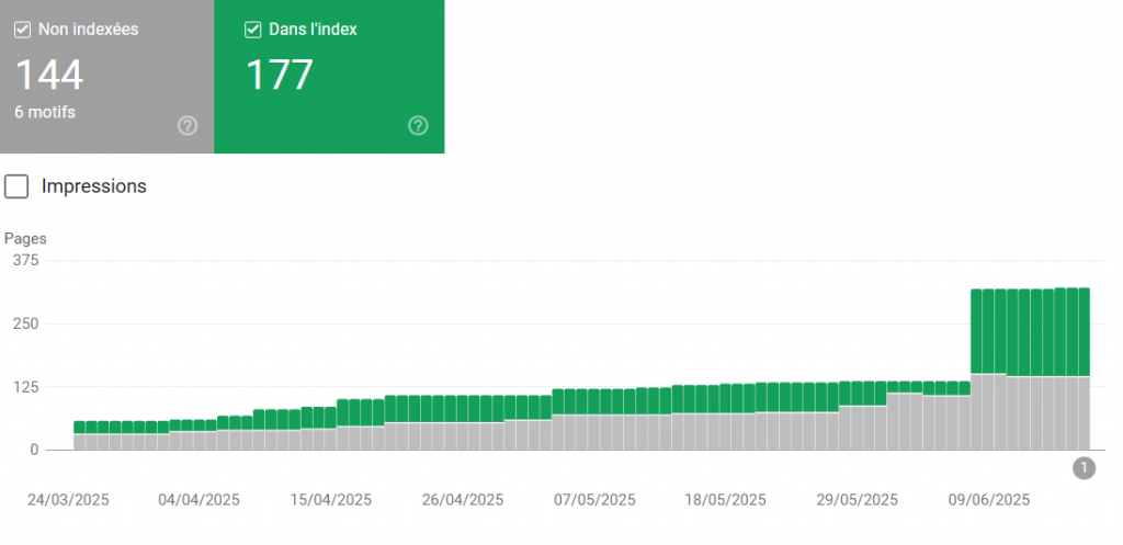 En analysant ma Google Search Console (voir la documentation officielle Google sur Search Console), j’ai constaté que plus de 140 pages étaient indexées… alors que seules une quinzaine apportaient réellement de la valeur aux visiteurs (et à mon activité).